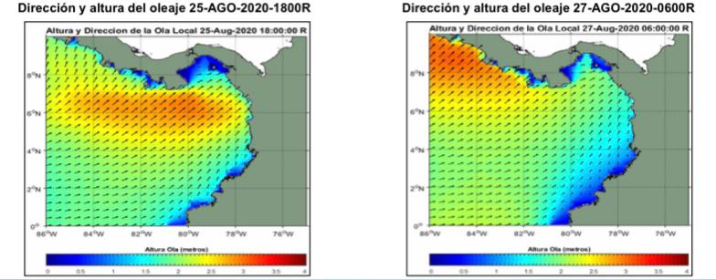 ⁃ Se prevé que del 25 al 27 de agosto de 2020 se presenten condiciones adversas por incremento en la altura del oleaje, asociado a un aumento de la velocidad del viento en las partes centro y norte de la zona de altamar de la Cuenca Pacífica Colombiana (CPC) y para las áreas marítimas aledañas. Durante este lapso, se espera que la altura de la ola oscile entre los 2.3 a 3,3 metros (fuerte marejada a gruesa).